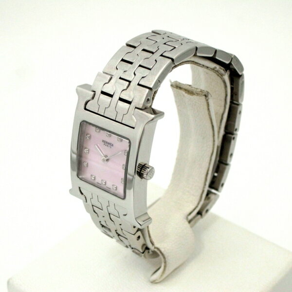 138744【中古】【HERMES】【エルメス】Hウォッチ HH1.210 SS ピンクシェル文字盤 12Pダイヤ クォーツHermes 箱付 レディース時計